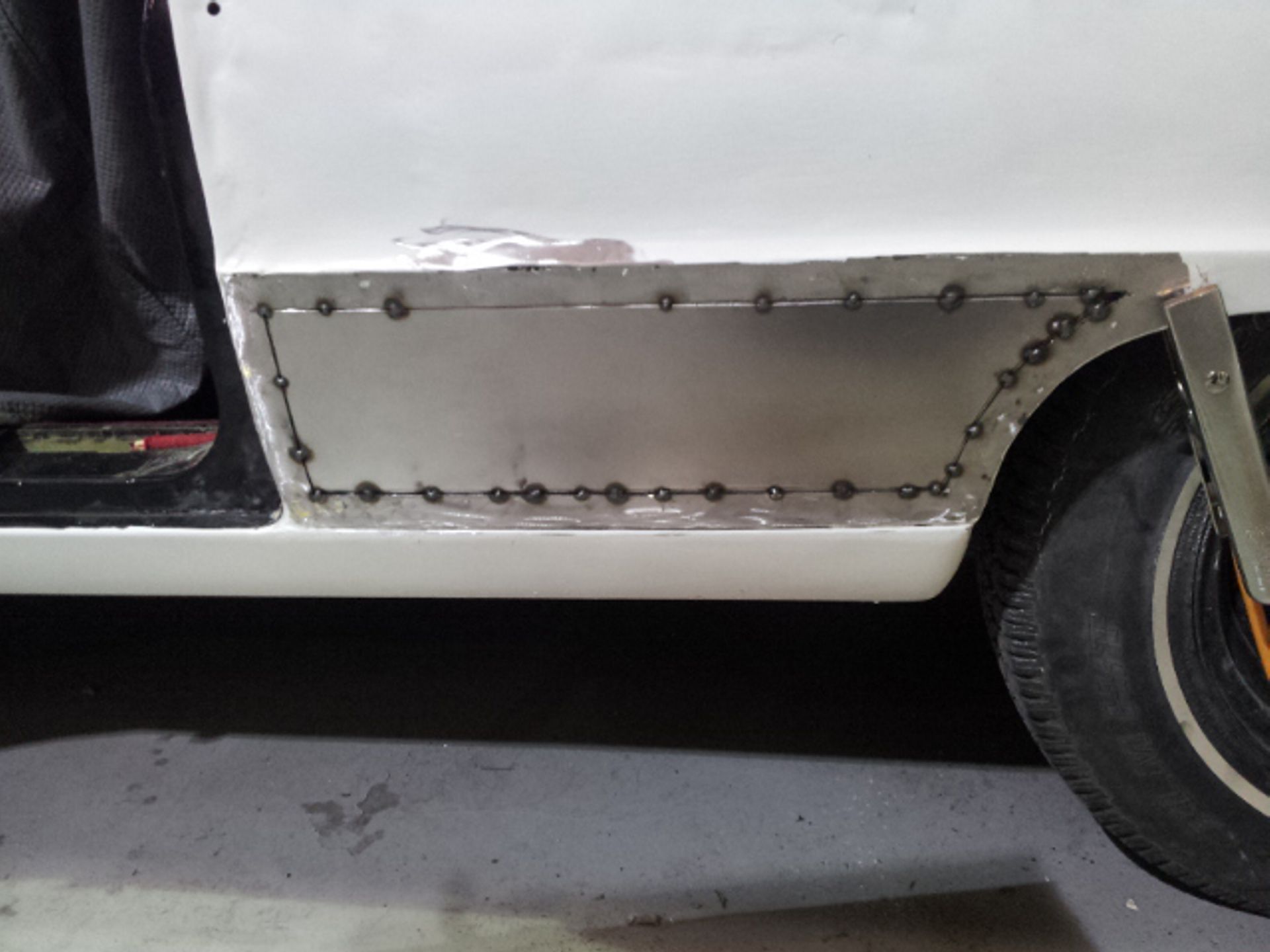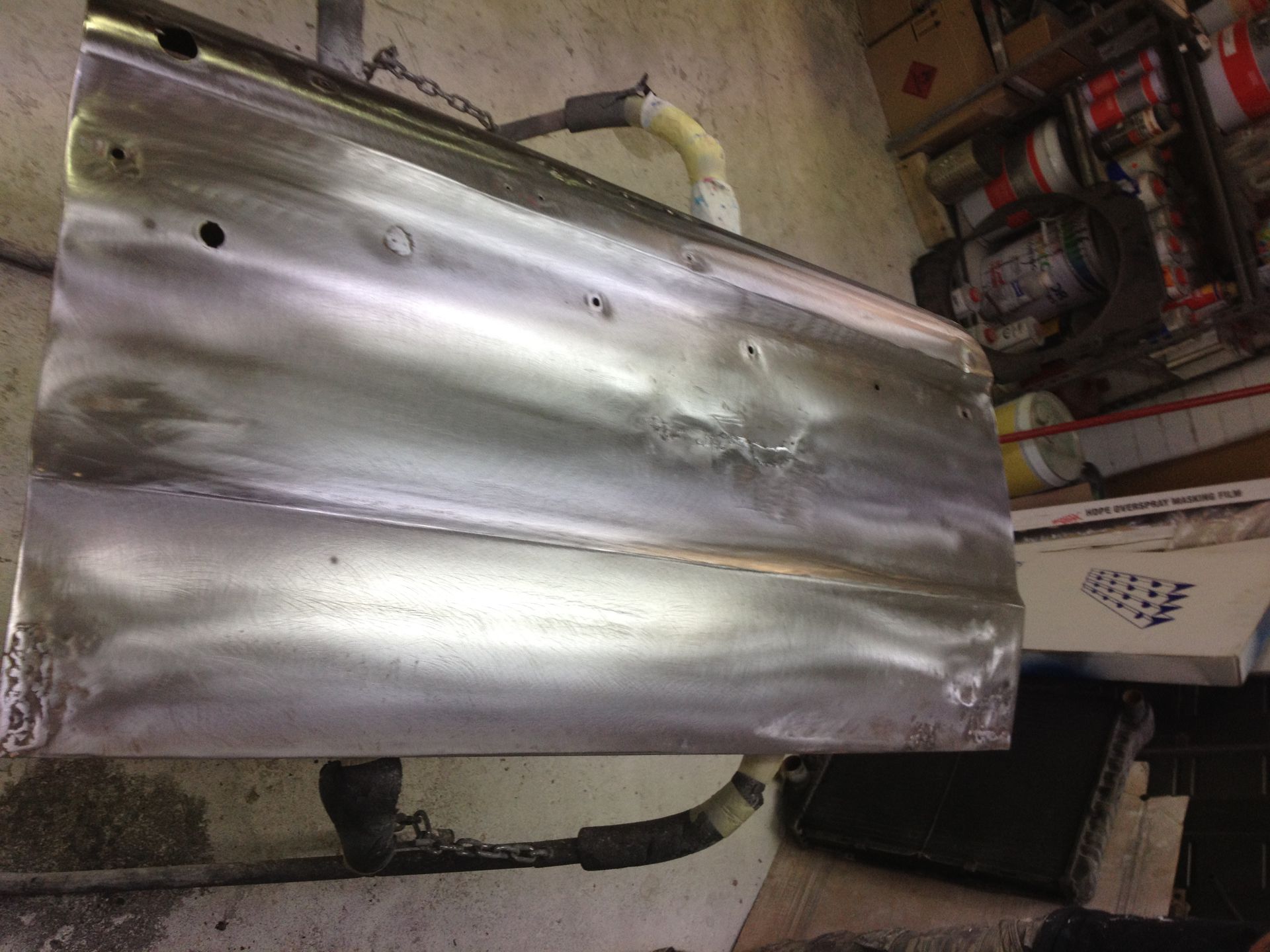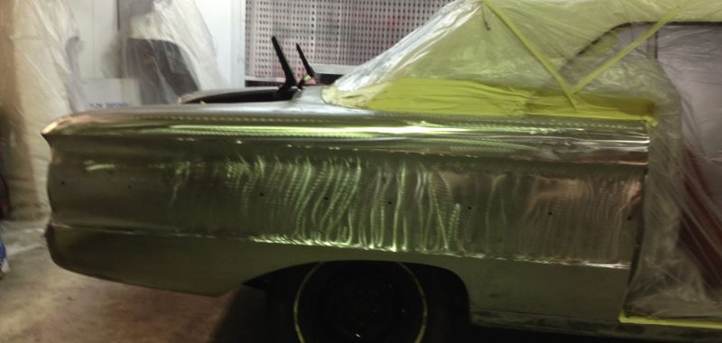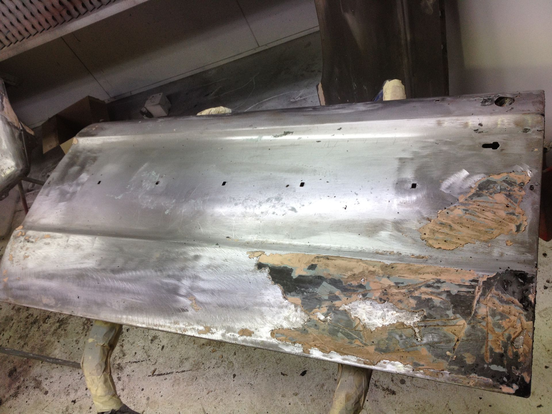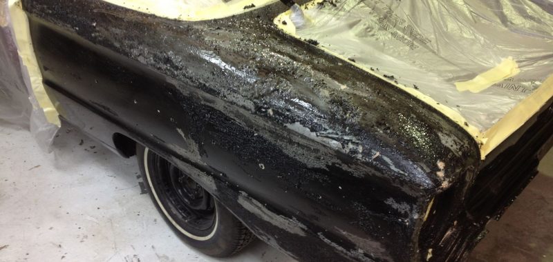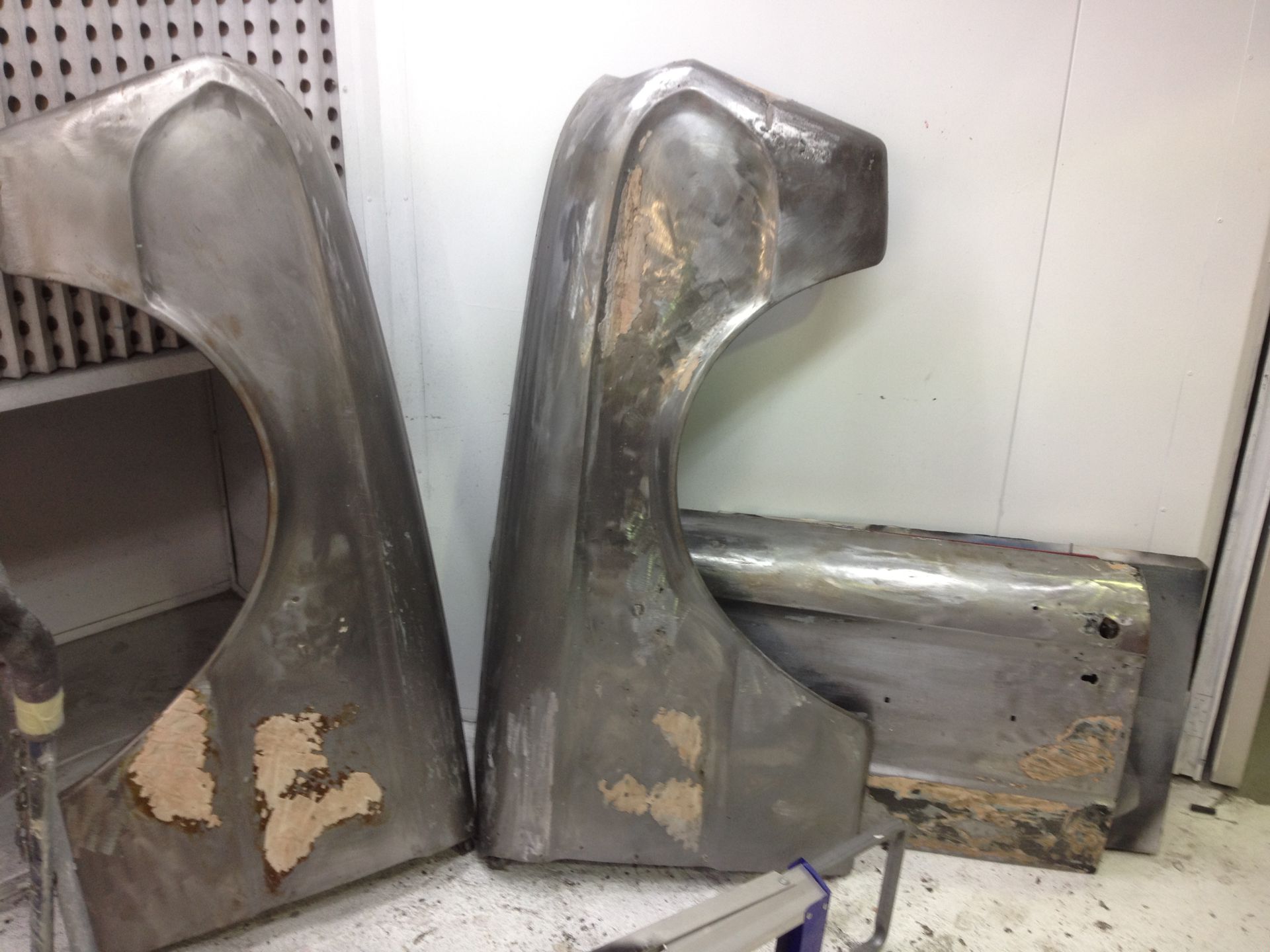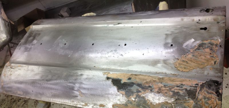 Damage to the door, trims and front guard Damage to the door, trims and front guard Customer requested a project change in direction from a simple door and guard repair to a total bare metal resprayThe paint stripping process beginsDetail shot showing how much filler was under that paintPaint stripped and ready for repairsLower quarter panel was rusted outNew lower quarter cut to shapeLower quarter panel section removedTack welded into placeFully Welded in placeNew section was required in the lower quarter just in front of the wheel tooNew section also required a new body line section as wellPartly welded in placeBoot area drip rail was very rusted and damagedDamaged section removedNew drip rail section folded up and curved to shapeNew drip rail section mocked upFront Guards chemically paint stripped revealing lots of old body fillerOne guard all repaired and ready for primerInitial primer blocked down ready for final primerIn final primer, ready for block down and colourBlocked down ready for colourInside of the bonnet and boot lid in colourIn colour and ready for final assembly