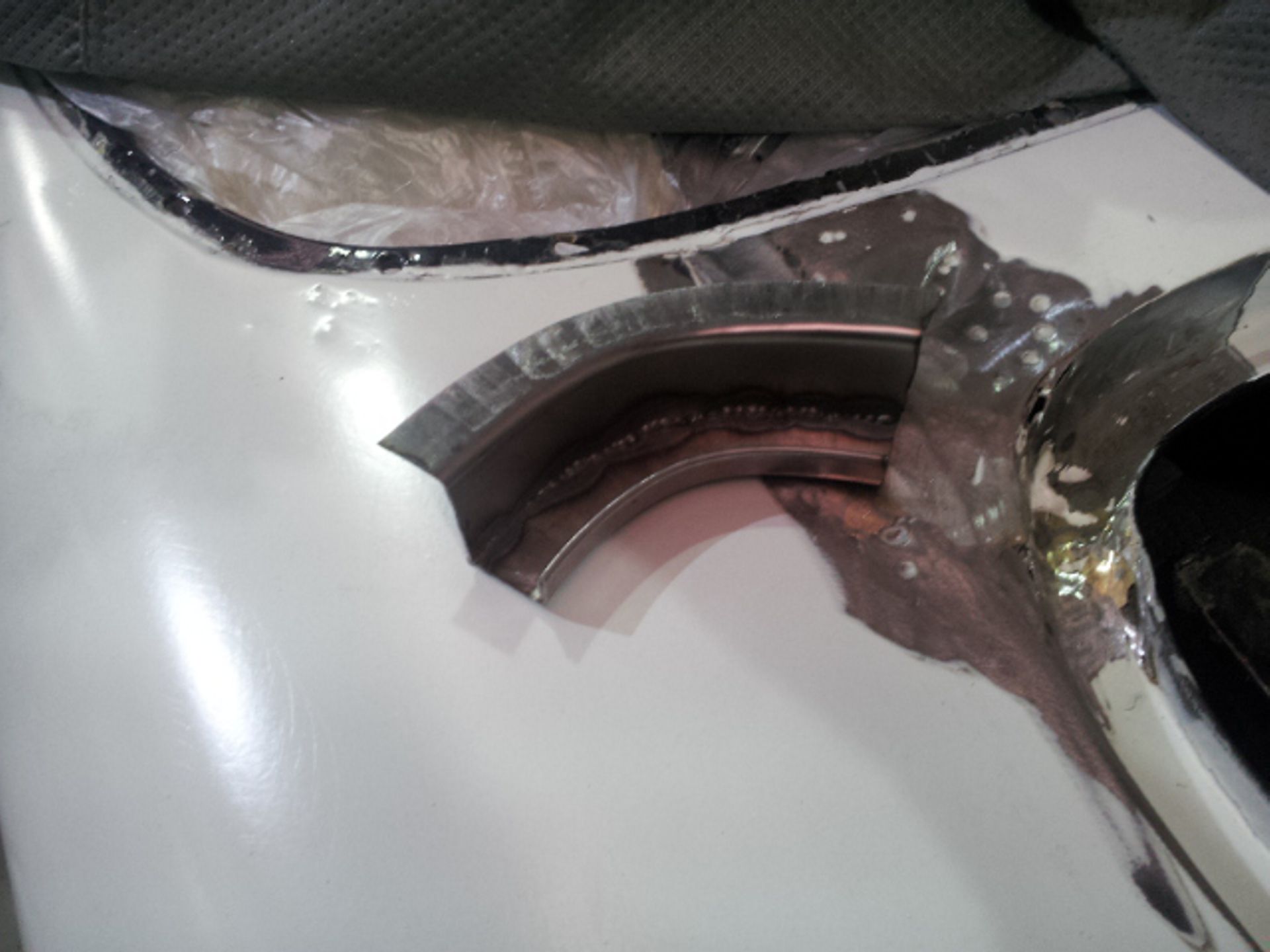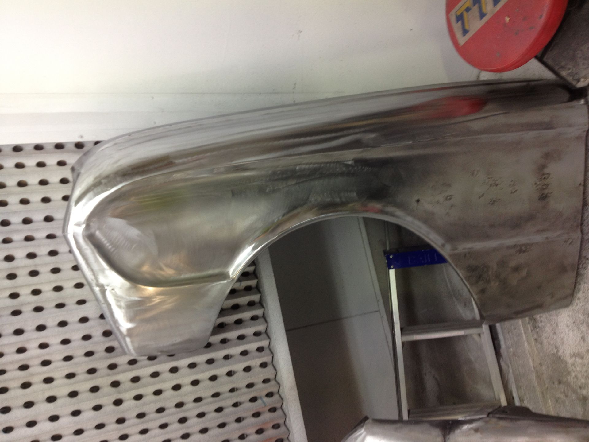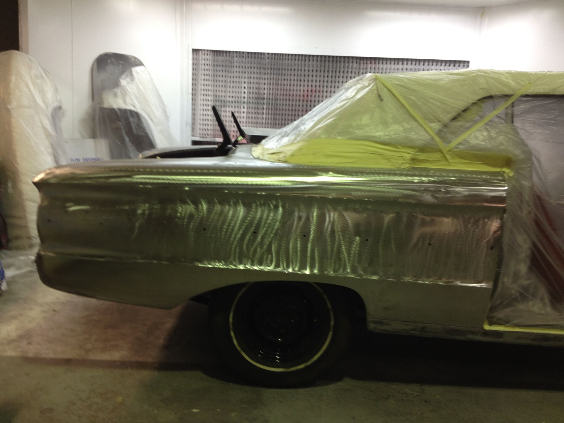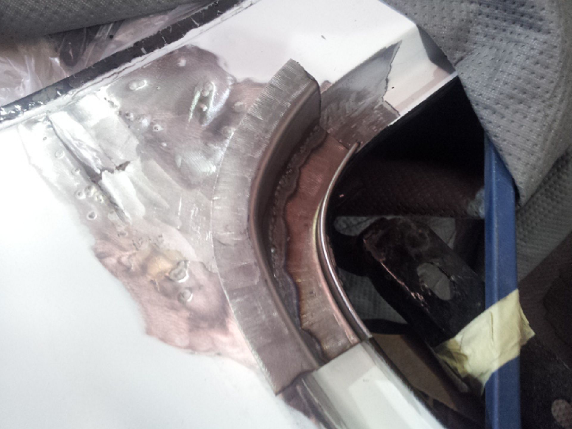 Damage to the door, trims and front guard Damage to the door, trims and front guard Customer requested a project change in direction from a simple door and guard repair to a total bare metal resprayThe paint stripping process beginsDetail shot showing how much filler was under that paintPaint stripped and ready for repairsLower quarter panel was rusted outNew lower quarter cut to shapeLower quarter panel section removedTack welded into placeFully Welded in placeNew section was required in the lower quarter just in front of the wheel tooNew section also required a new body line section as wellPartly welded in placeBoot area drip rail was very rusted and damagedDamaged section removedNew drip rail section folded up and curved to shapeNew drip rail section mocked upFront Guards chemically paint stripped revealing lots of old body fillerOne guard all repaired and ready for primerInitial primer blocked down ready for final primerIn final primer, ready for block down and colourBlocked down ready for colourInside of the bonnet and boot lid in colourIn colour and ready for final assembly