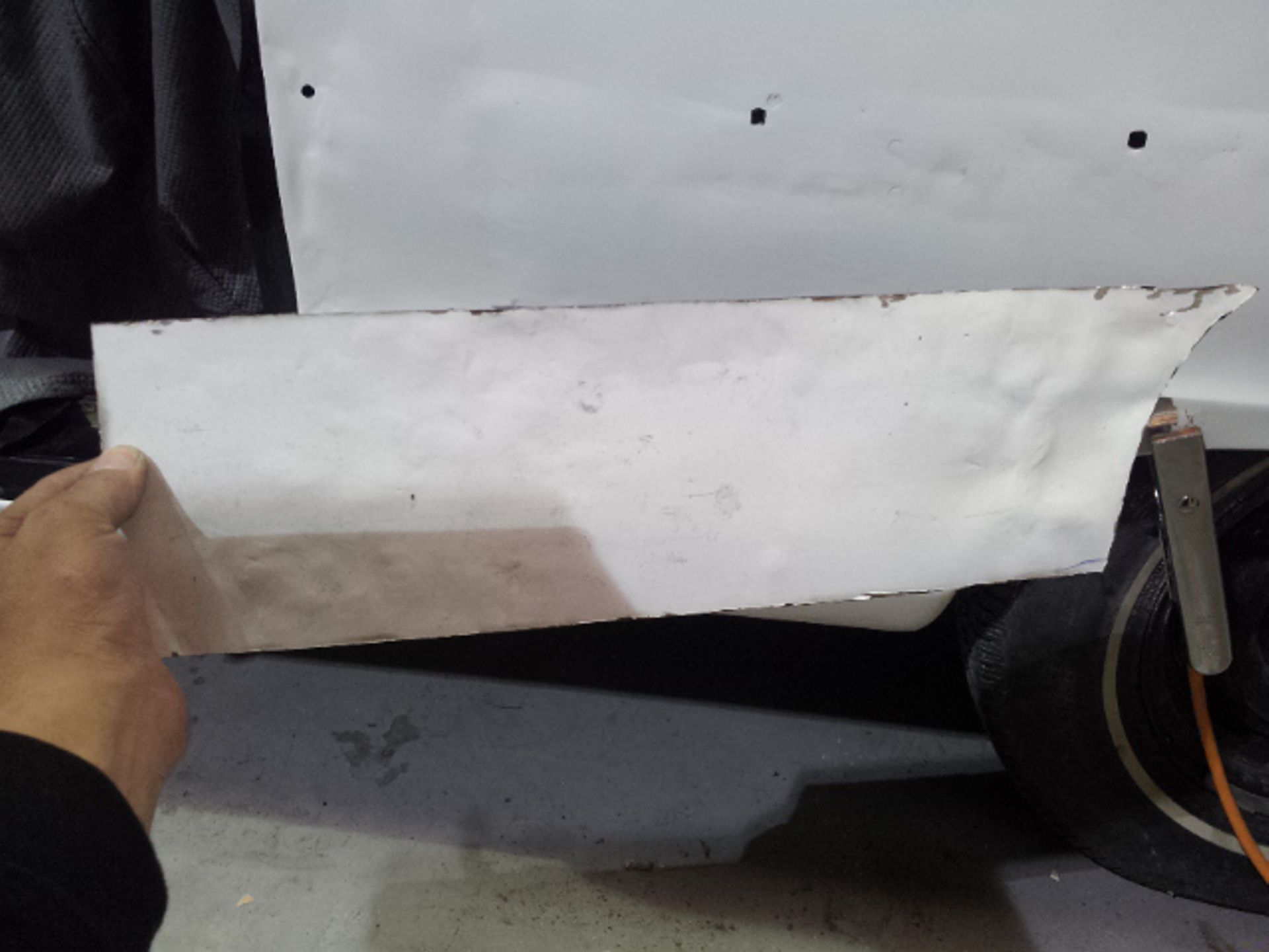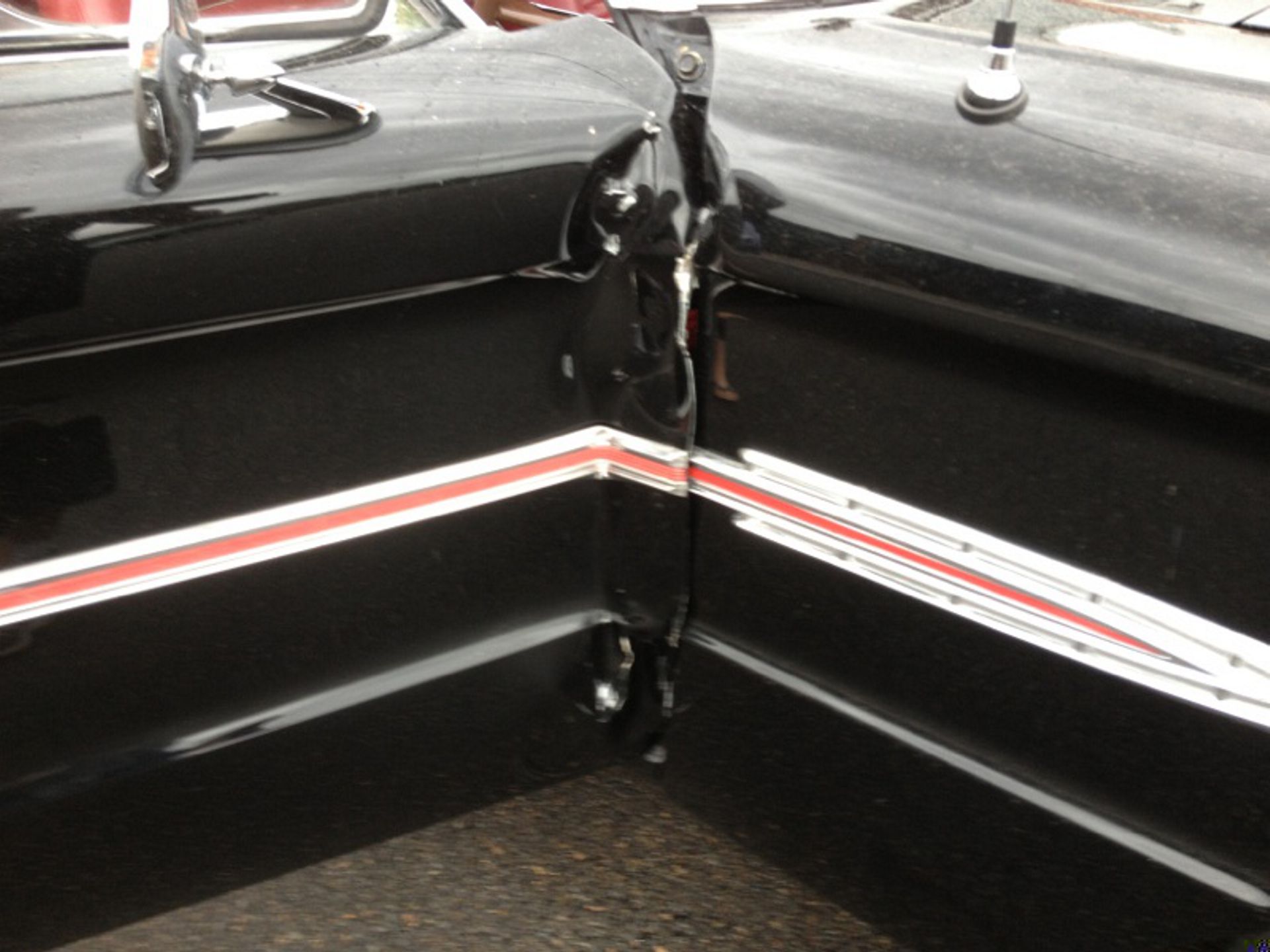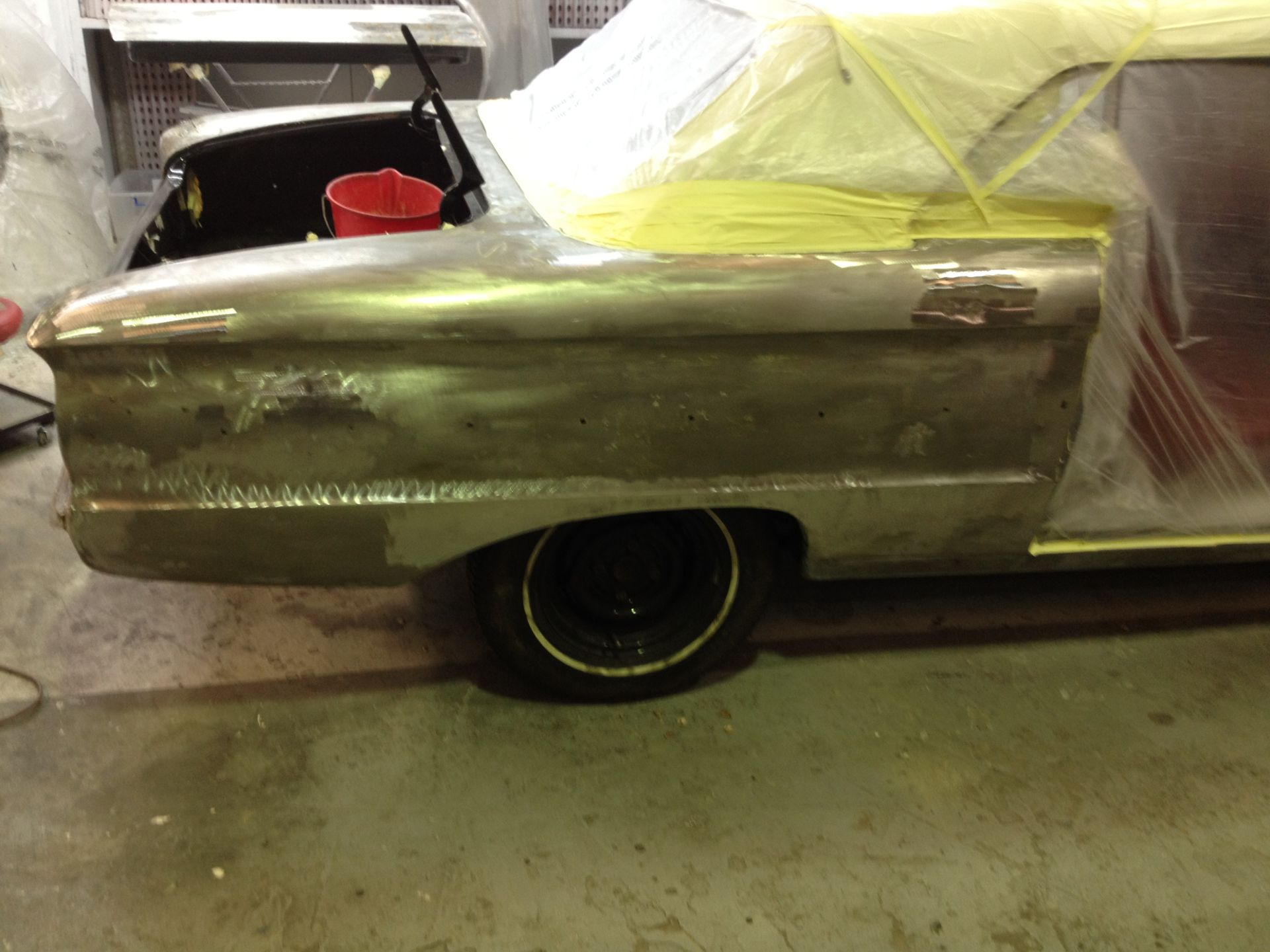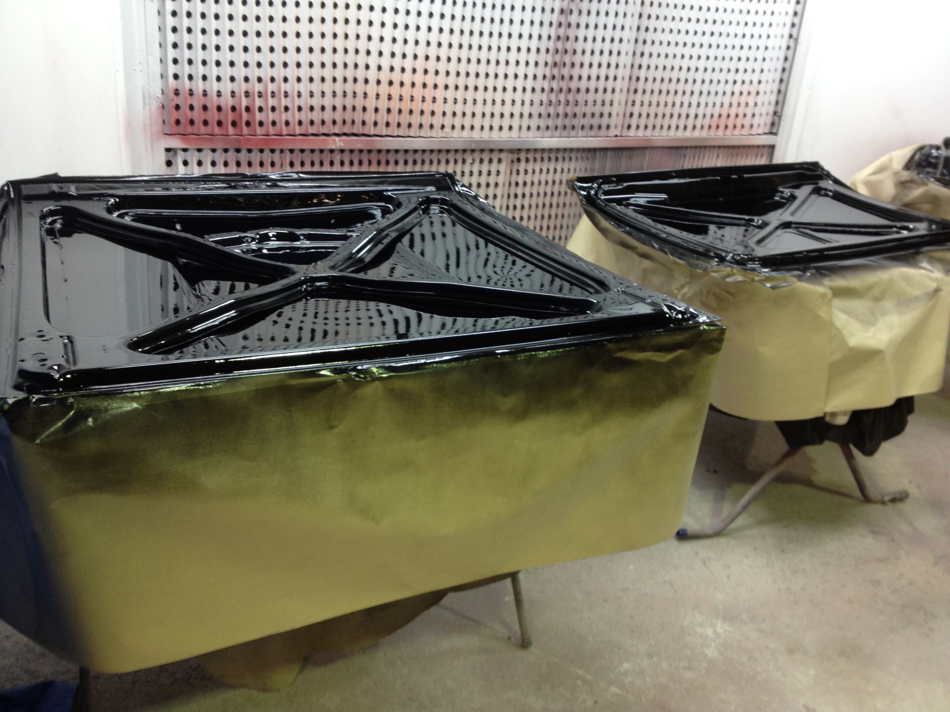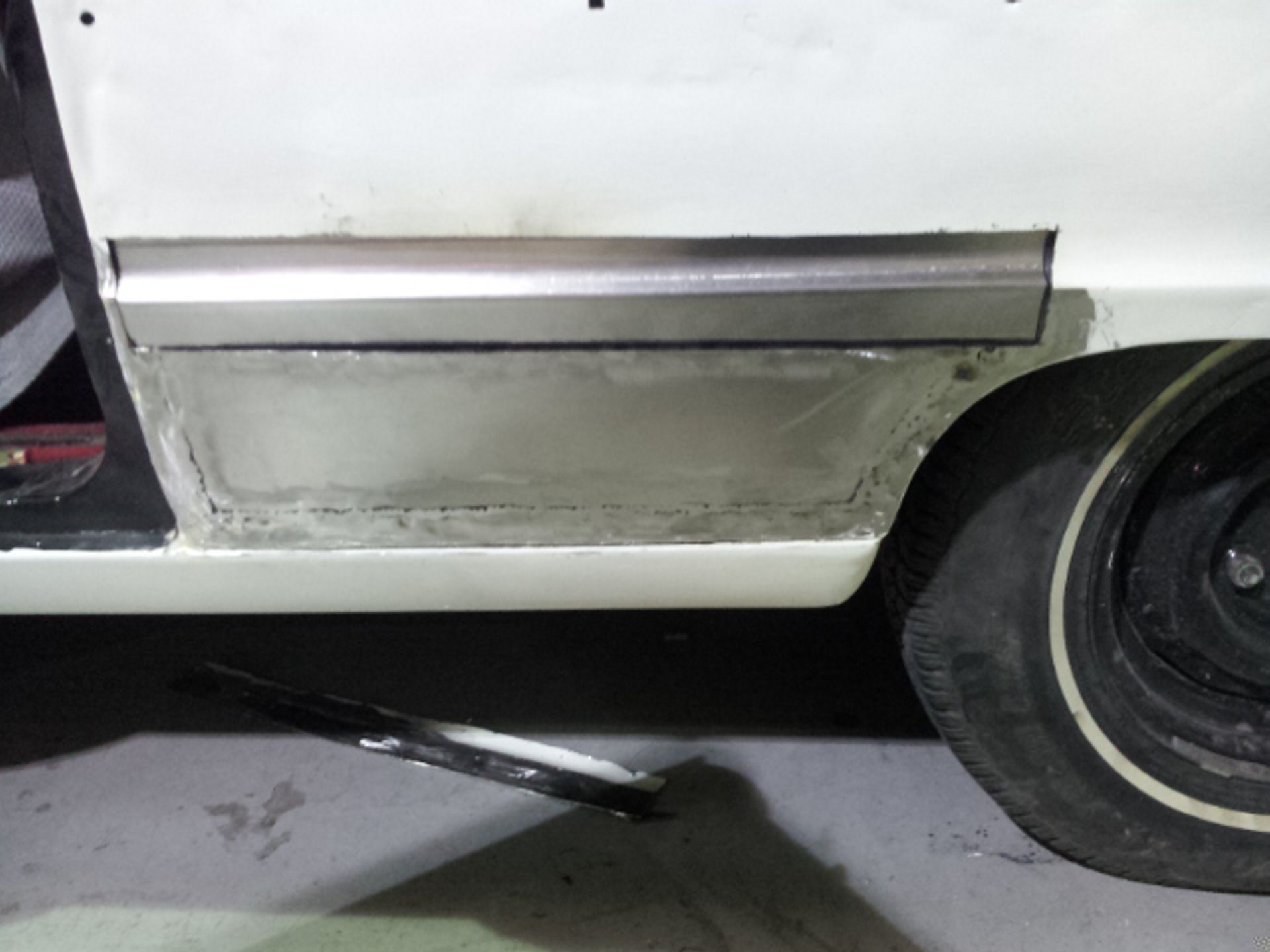 Damage to the door, trims and front guard Damage to the door, trims and front guard Customer requested a project change in direction from a simple door and guard repair to a total bare metal resprayThe paint stripping process beginsDetail shot showing how much filler was under that paintPaint stripped and ready for repairsLower quarter panel was rusted outNew lower quarter cut to shapeLower quarter panel section removedTack welded into placeFully Welded in placeNew section was required in the lower quarter just in front of the wheel tooNew section also required a new body line section as wellPartly welded in placeBoot area drip rail was very rusted and damagedDamaged section removedNew drip rail section folded up and curved to shapeNew drip rail section mocked upFront Guards chemically paint stripped revealing lots of old body fillerOne guard all repaired and ready for primerInitial primer blocked down ready for final primerIn final primer, ready for block down and colourBlocked down ready for colourInside of the bonnet and boot lid in colourIn colour and ready for final assembly